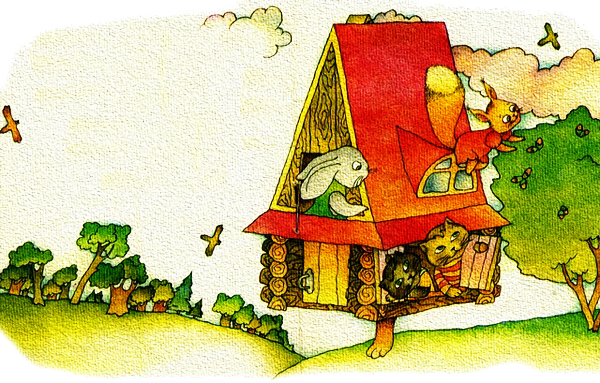 А белка плачет, слезами обливается. Догадался Кролик, что Фарамушка есть хочет. Стал он по лесу бегать, еду белке искать, да ничего найти не может. Вспомнил Кролик, что на опушке, в маленькой избушке, котята живут. Необыкновенная у них избушка, волшебная, стоит на кошачьей лапке, во все стороны поворачивается.