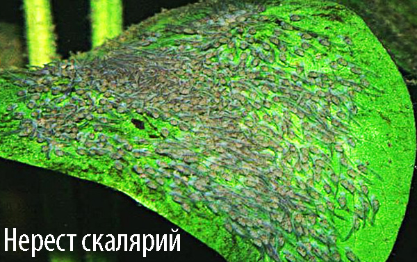 При массовом разведении скалярий обычно рекомендуют устанавливать в нерестовик или общий аквариум искусственные пластмассовые листья или пластинку из зеленого оргстекла. Но нередко случается, что рыбы не обращают на них никакого внимания и откладывают икру на другие предметы. Поэтому искусственный субстрат лучше установить в аквариум незадолго до первого нереста. Замечено, что рыбы «запоминают» внешний вид субстрата и, отметав однажды на него икру, в дальнейшем будут упорно стремиться к нему.