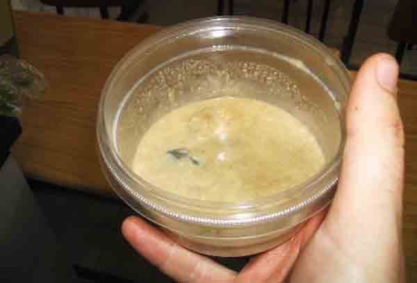 К концу пятых суток происходит рассасывание желточного мешка, и молодь переходит на активное питание. Первым кормом может быть «живая пыль», в крайнем случае — простокваша. Что такое «живая пыль», наш читатель уже знает, а вот как кормить простоквашей? Небольшое количество простокваши или «слабого» молока заливают кипятком, чтобы молочный белок свернулся. С помощью плотного газового сачка сгусток отделяют и промывают чистой водой. Затем сачок со сгустком опускают в воду аквариума и потряхивают, пока не появится облачко мелких частиц корма. Надо сказать, что простокваша не портит воды. Ее можно хранить несколько дней в холодильнике.