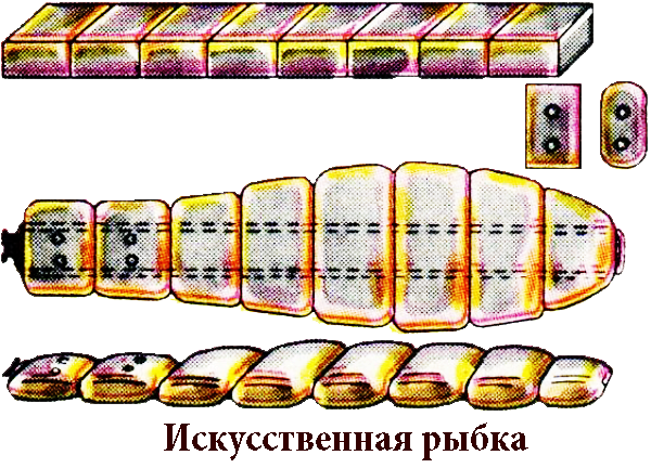 Мормышку можно оснастить искусственной рыбкой. Для этого годится кусочек оргстекла, но еще лучше — пластмассовая ручка от зубной щетки. Разрезаю ручку на семь-восемь частей, просверливаю или прожигаю толстой иглой отверстия, обрабатываю надфилем, крашу серебрянкой, насаживаю все части на проволоку, придаю форму рыбки. Затем проволоку заменяю капроновой нитью и привязываю рыбку к мормышке.