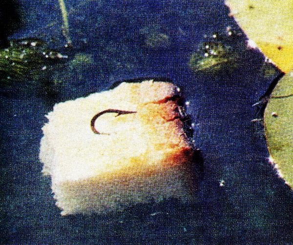 Для нас кусок хлеба имеет довольно пресный вкус и запах, и в этом, вероятно, состоит причина широкого распространения бутербродов. Но для рыб естественный вкус хлеба представляется очень соблазнительным. Не исключено, что цвет хлеба также имеет значение. Если голова рыбы не погружена в донный ил, лежащий на дне белый кусочек, по-видимому, привлечет внимание даже таких рассеянных рыб, как линь или карп.