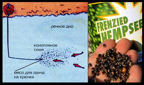 Гораздо дешевле в качестве донной прикормки использовать конопляное семя, чем мясо. Сделайте подстилку из конопляного семени длиной примерно 1,5 м для ловли голавля и усача и положите на нее насадку с мясом для ланча. Рыбу будет привлекать запах конопли, она заметит вкусный кусочек мяса, лежащий в самом видном месте прямо на семенах конопли, и последствия очевидны.