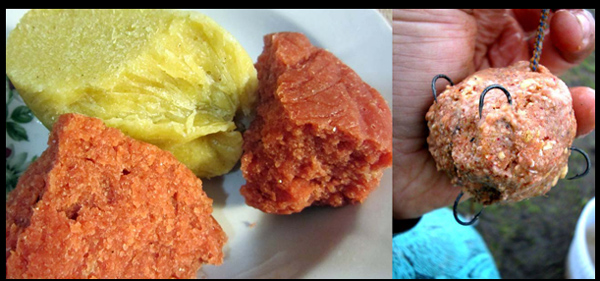 • Волшебные составляющие для мясных насадок включают: тушеный стейк (1) — используйте кусочек размером с личинку мухи; мясо для ланча (2), порезанное на кубики, соответствующие размеру крючка, — кубики справа были слегка поджарены в течение нескольких минут. Сосисочный фарш и мелкая донная прикормка (3), смешанные вместе, представляют собой хорошую прикормочную смесь (4). Хорошую насадку можно приготовить, перемешав оба компонента до получения однородной массы.