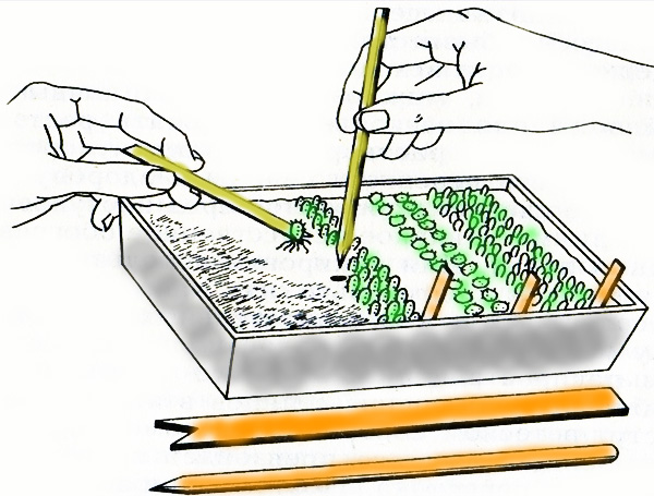 Для плотной пикировки крошечных сеянцев используют вырезанные из дощечки пикировочные вилочку и палочку