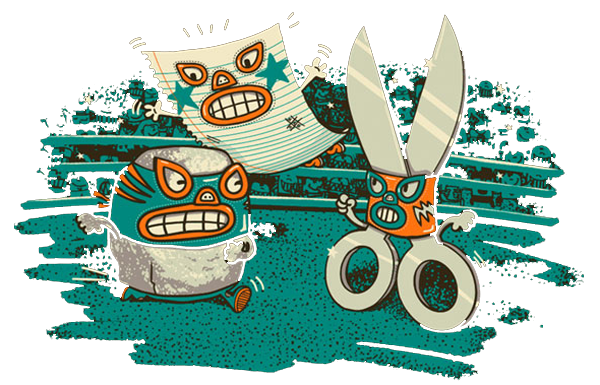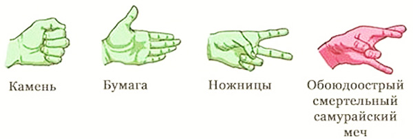 В этой игре все участники одновременно показывают рукой камень, ножницы или бумагу. Как известно, камень затупляет ножницы, ножницы режут бумагу, а бумага накрывает камень. Побеждает тот, кому удается взять верх над остальными игроками.